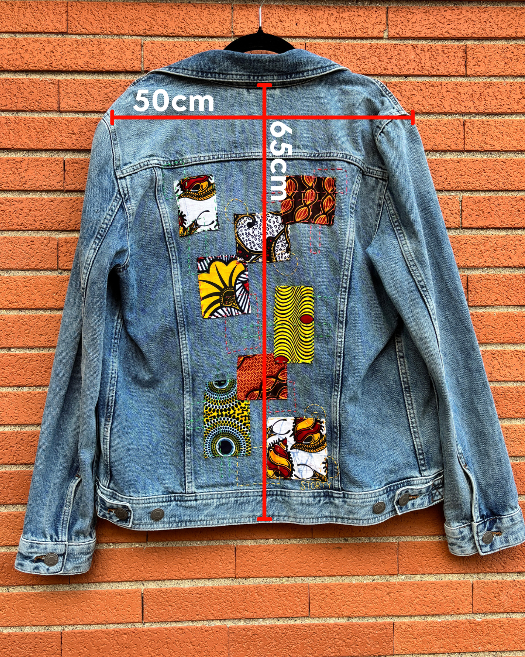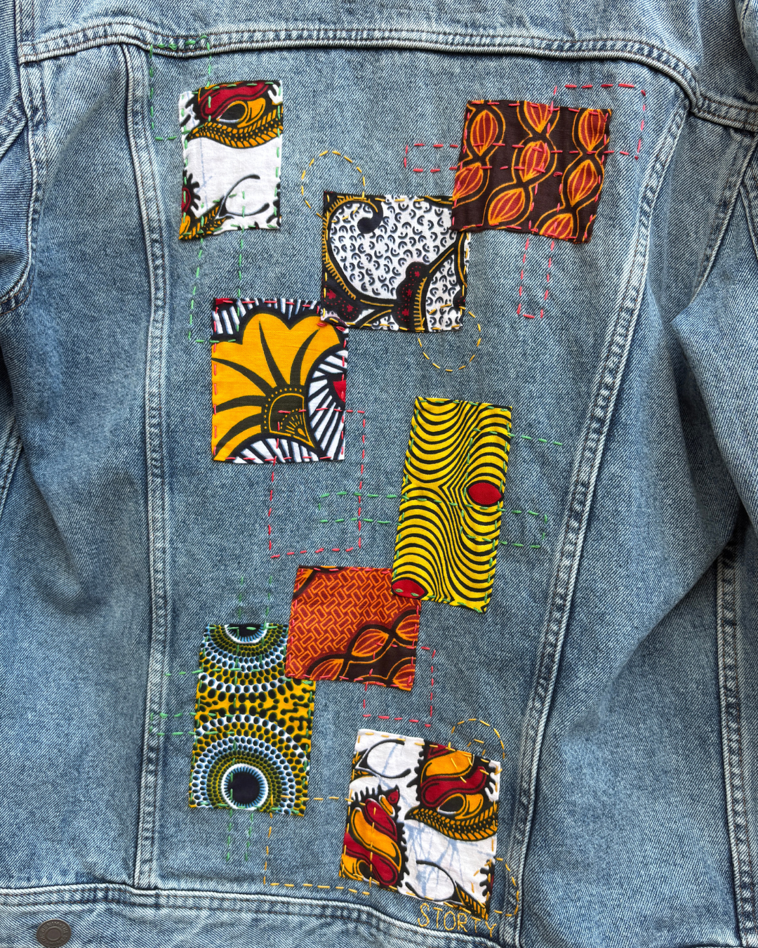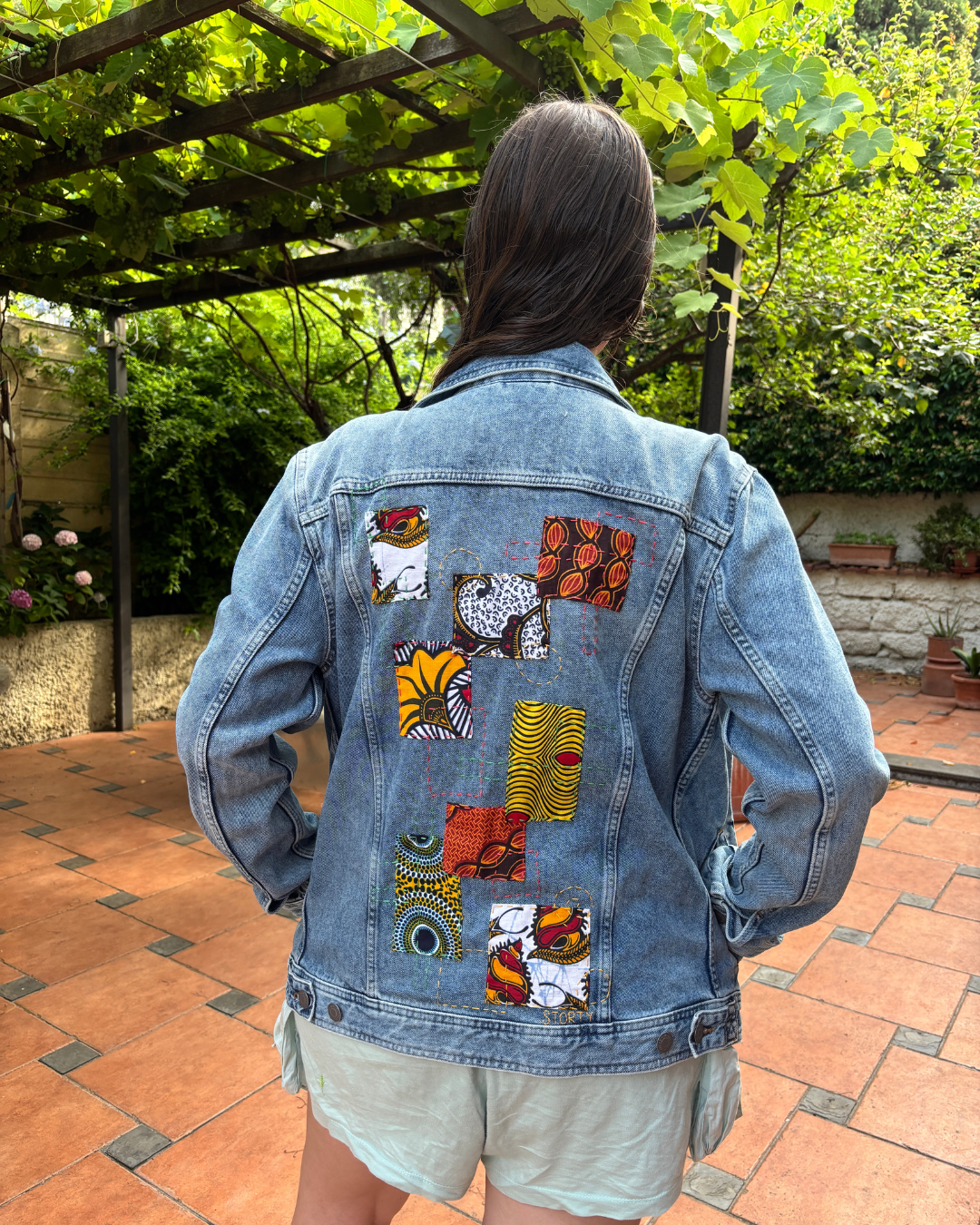 Giacca di jeans in denim chiaro dal fit regular con upcycling con la tecnica del sashiko: patchwork di tessuto wax e ricami.
