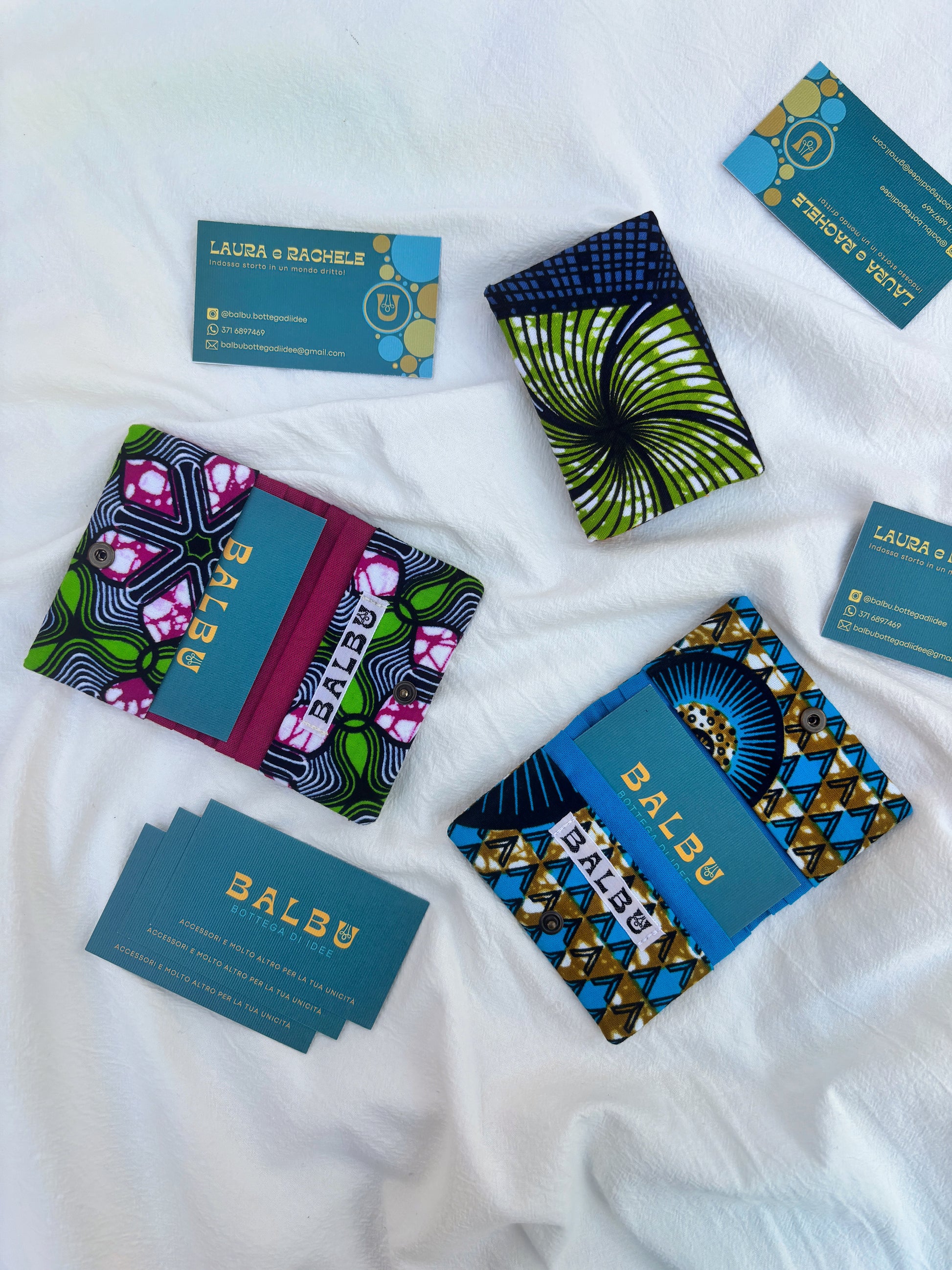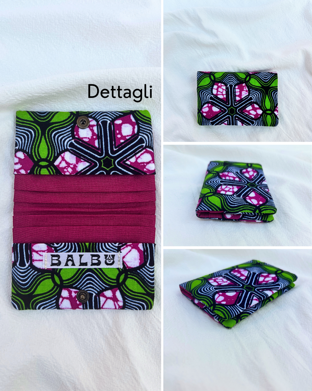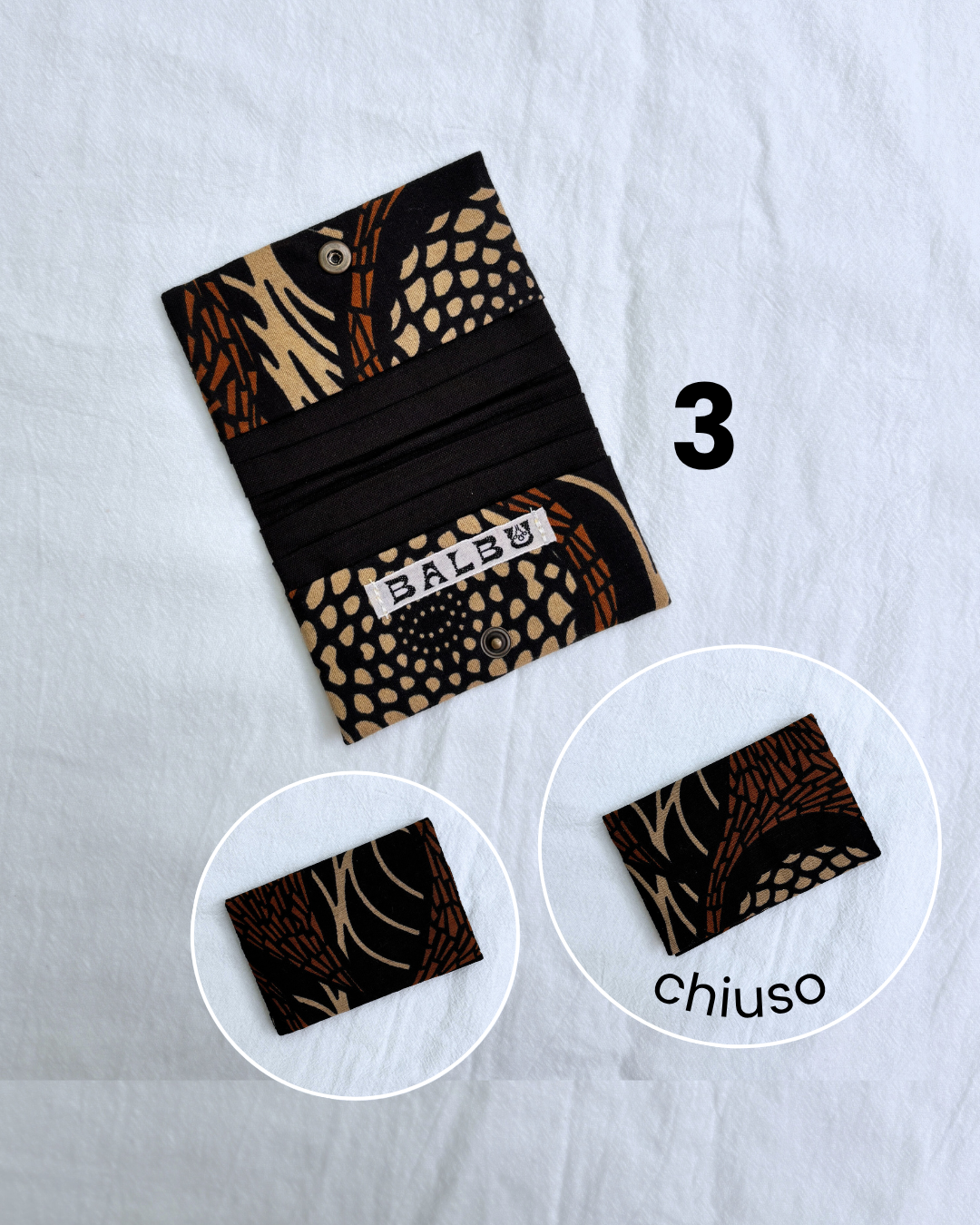 Porta carte di stoffa rinforzato con sei scomparti per le carte (ma se ne possono mettere più di una per scomparto); chiusura con bottone automatico.