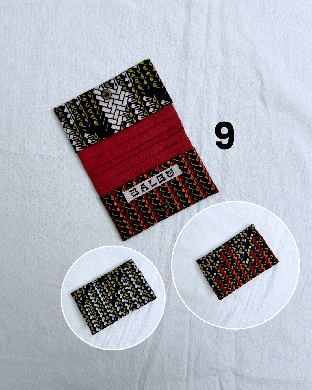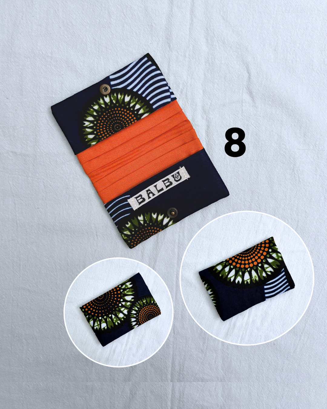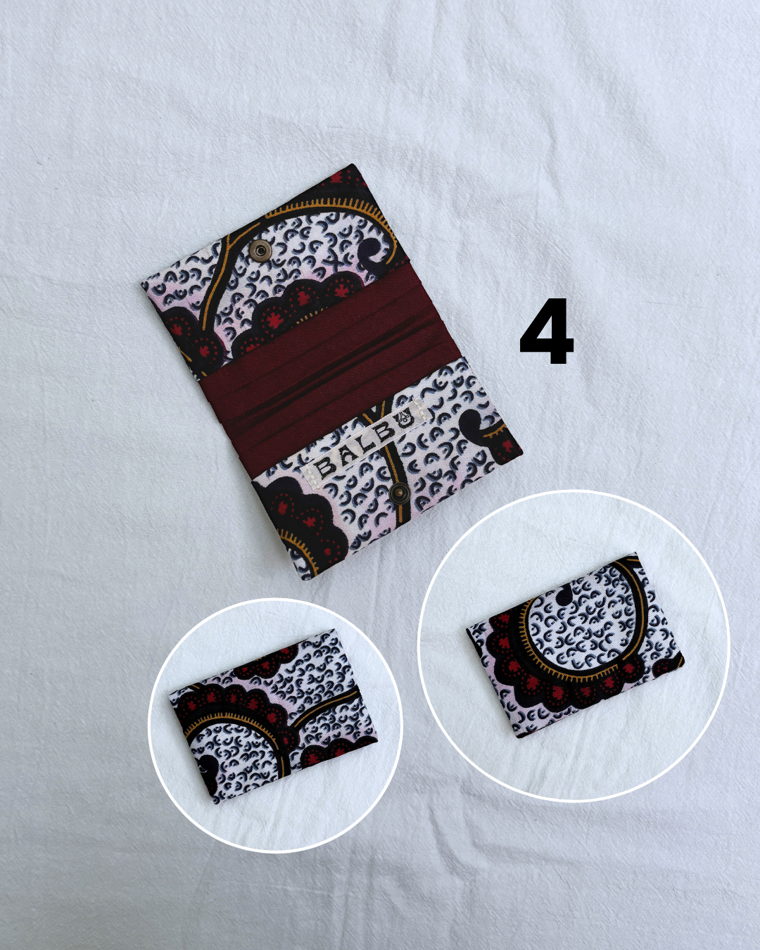 Porta carte di stoffa rinforzato con sei scomparti per le carte (ma se ne possono mettere più di una per scomparto); chiusura con bottone automatico.