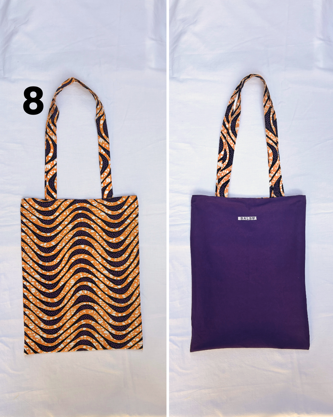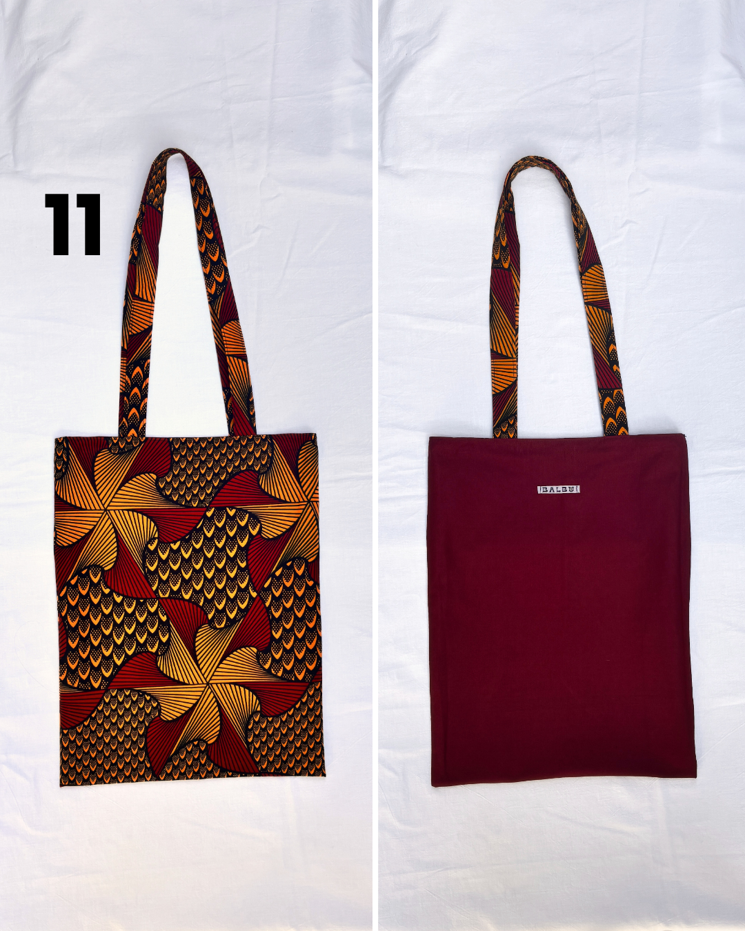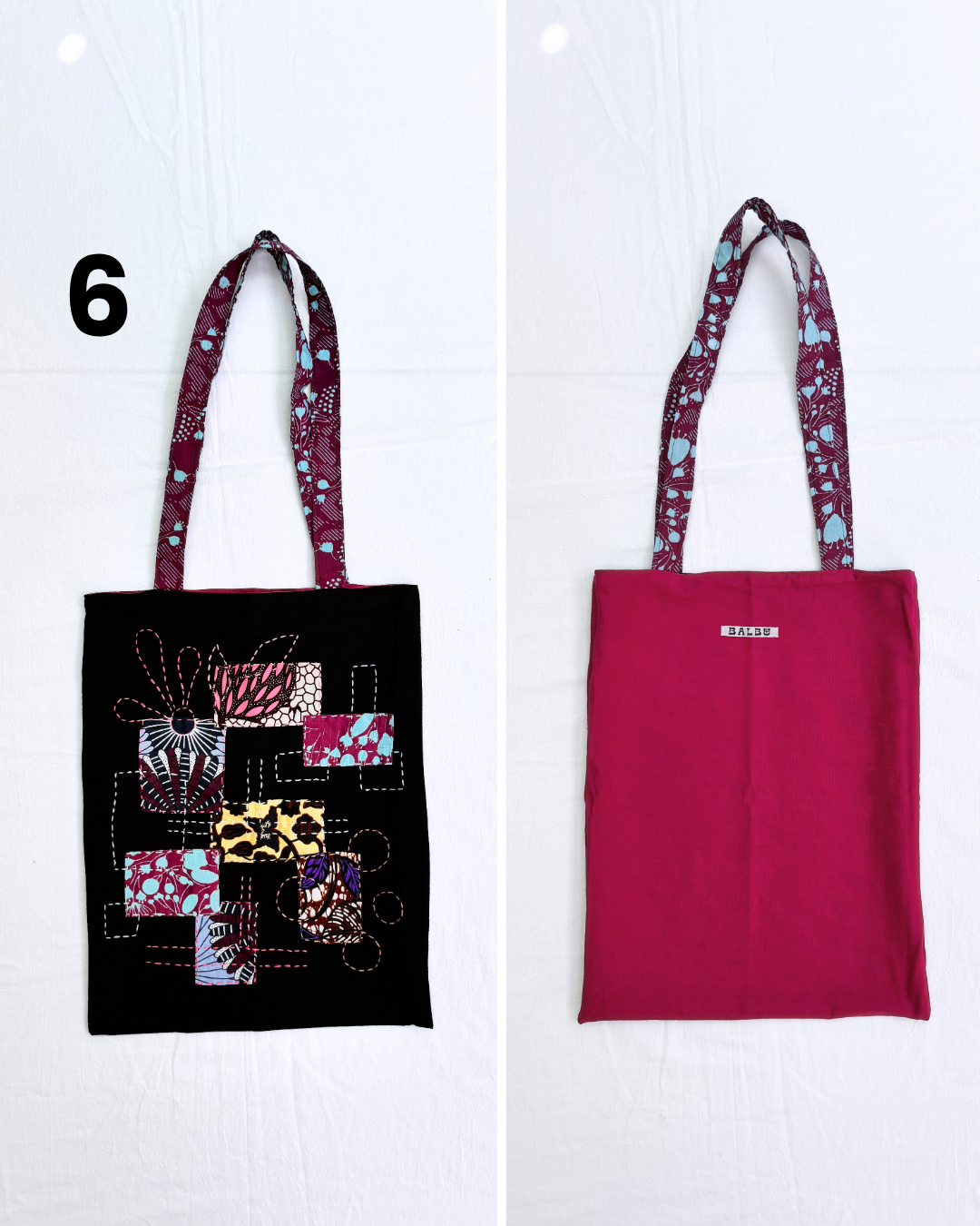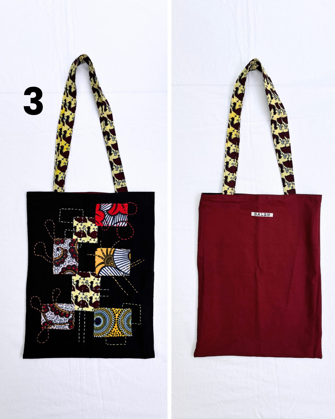 Alcune varianti sono completamente realizzate in tessuto wax, mentre altre utilizzano la tecnica giapponese del sashiko, creando un patchwork di ritagli di tessuto wax su un tessuto di cotone tinta unita, integrato con dei ricami. Il prezzo di quelle realizzate con il sashiko è di 24,00€ poiché la lavorazione è più complessa.