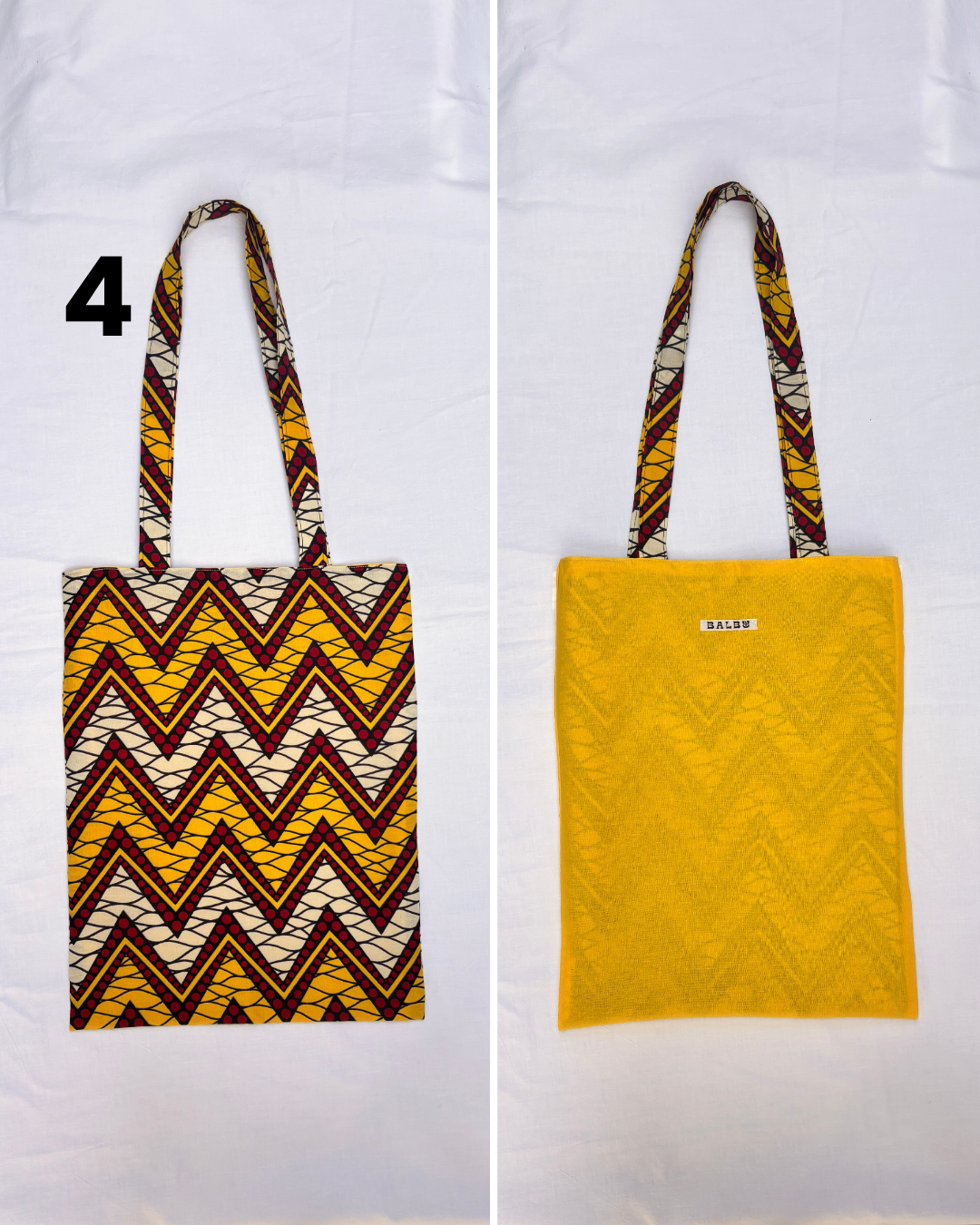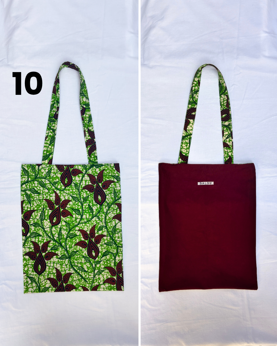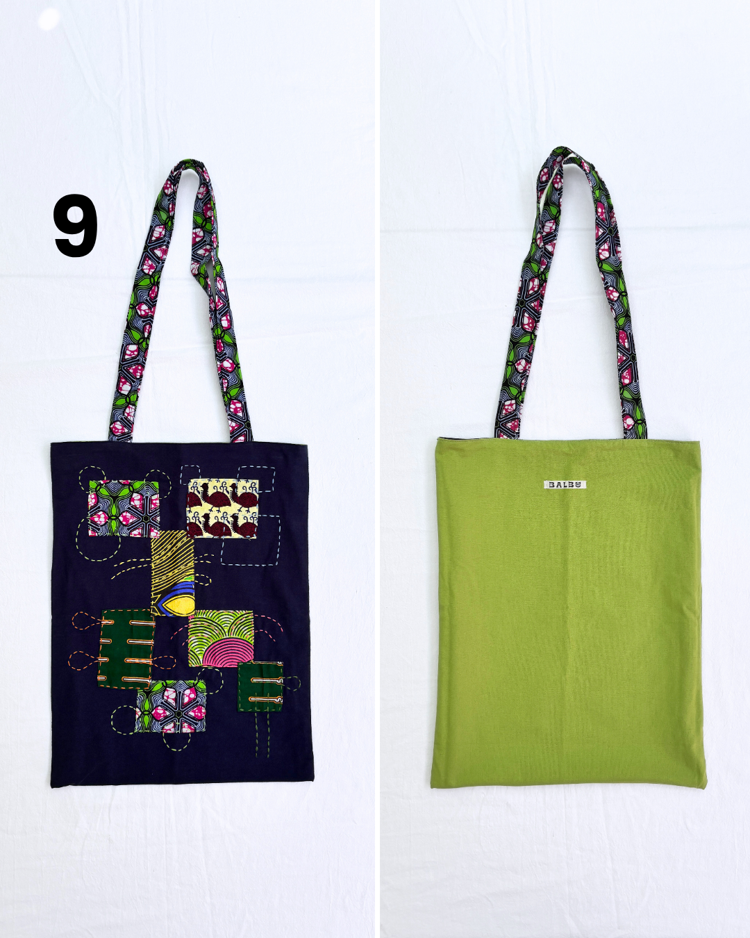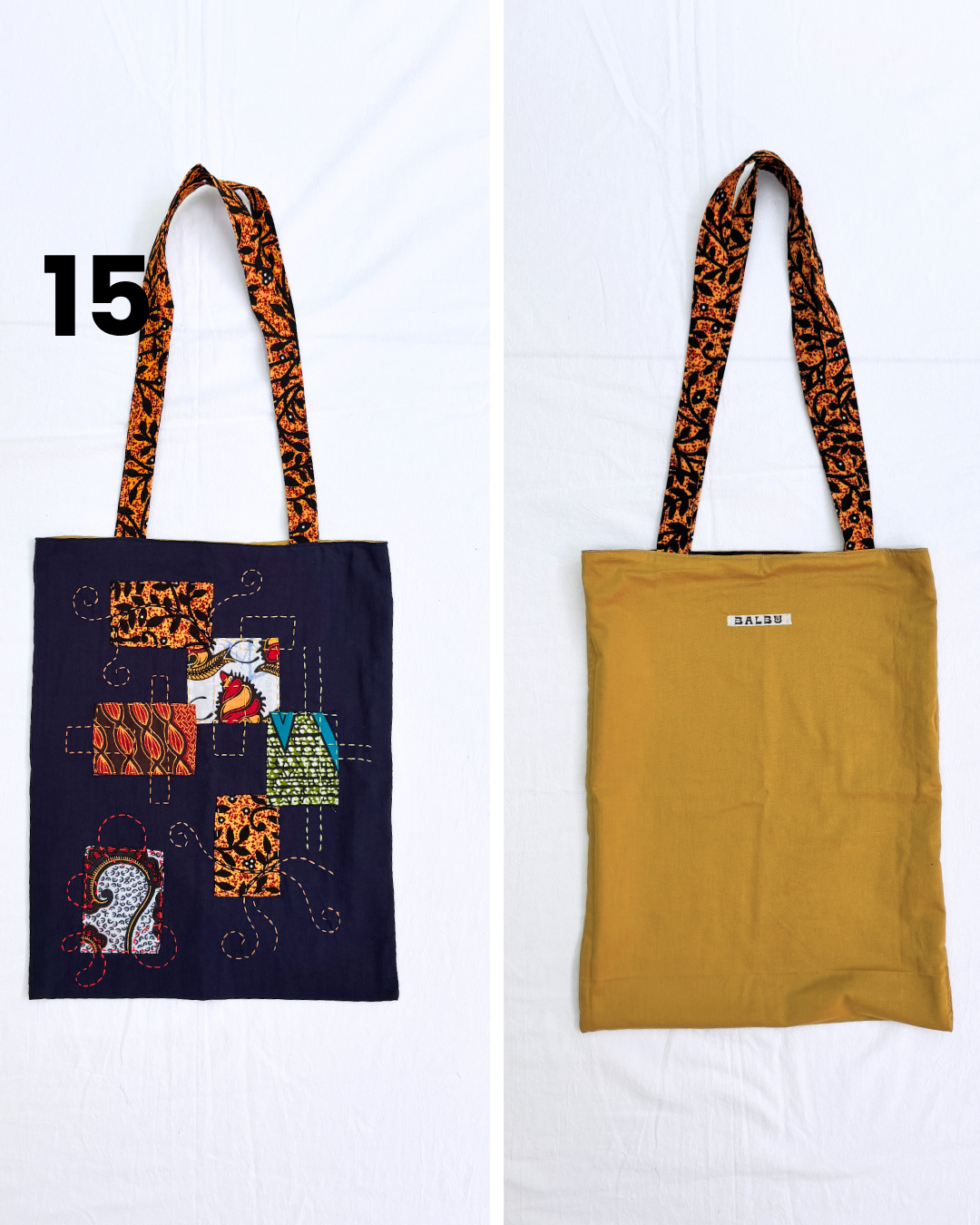 Alcune varianti sono completamente realizzate in tessuto wax, mentre altre utilizzano la tecnica giapponese del sashiko, creando un patchwork di ritagli di tessuto wax su un tessuto di cotone tinta unita, integrato con dei ricami. Il prezzo di quelle realizzate con il sashiko è di 24,00€ poiché la lavorazione è più complessa.
