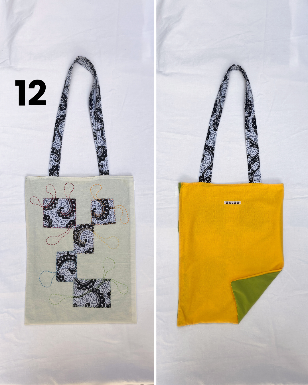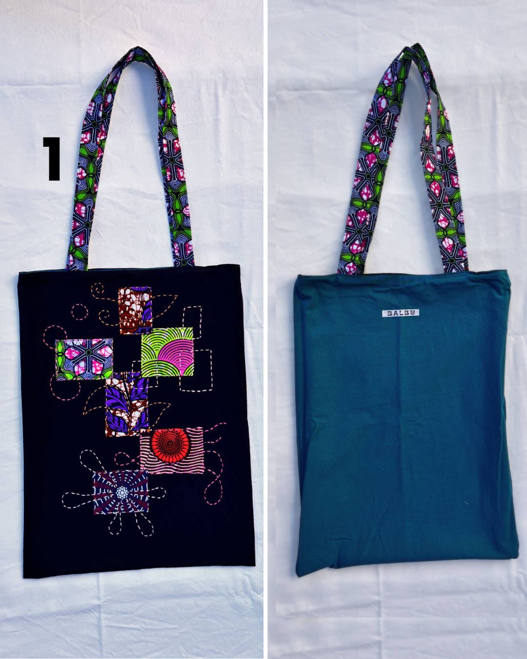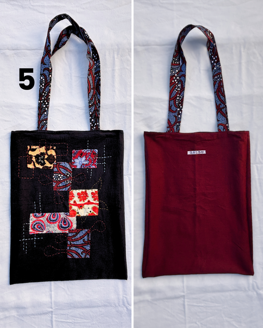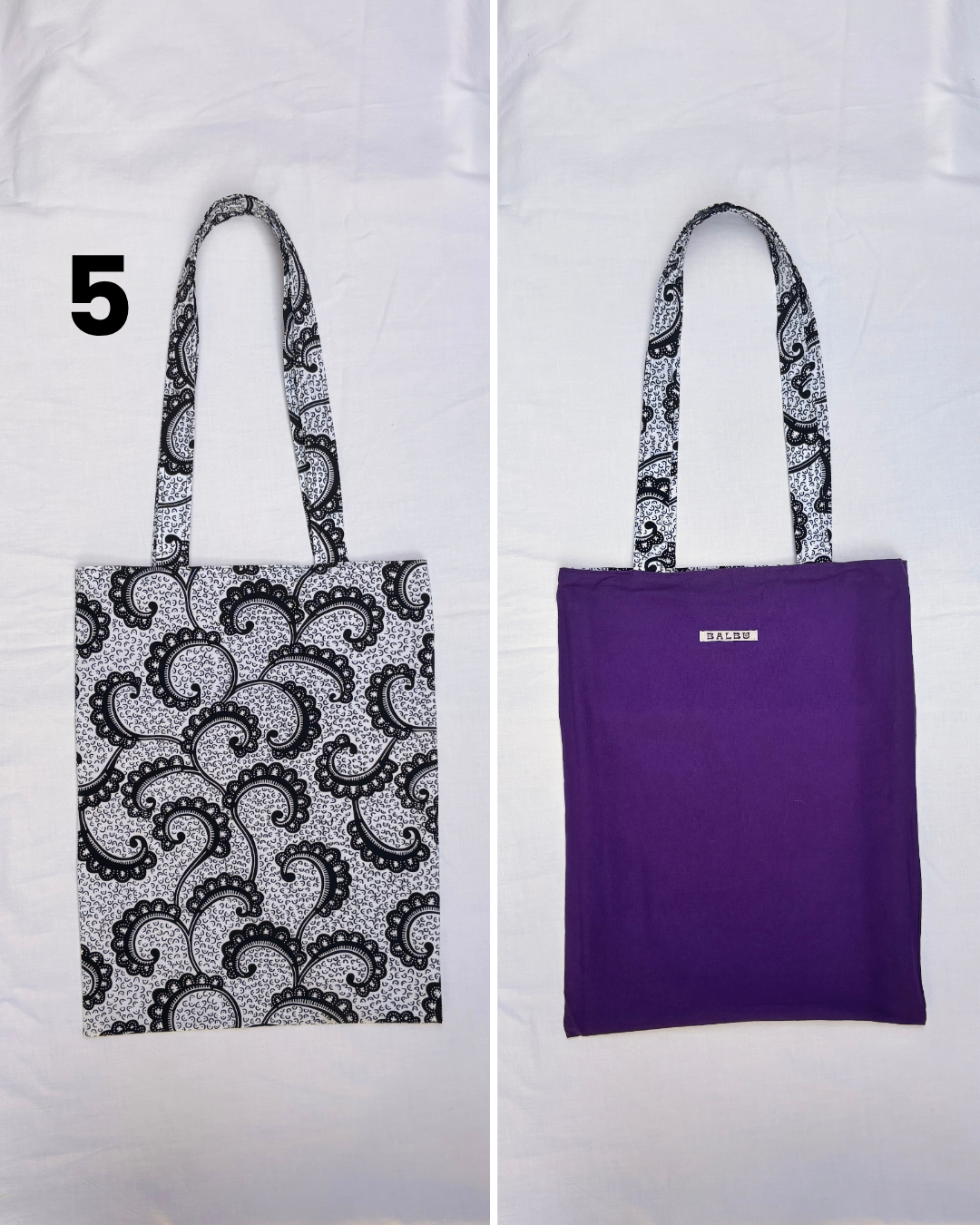 Alcune varianti sono completamente realizzate in tessuto wax, mentre altre utilizzano la tecnica giapponese del sashiko, creando un patchwork di ritagli di tessuto wax su un tessuto di cotone tinta unita, integrato con dei ricami. Il prezzo di quelle realizzate con il sashiko è di 24,00€ poiché la lavorazione è più complessa.